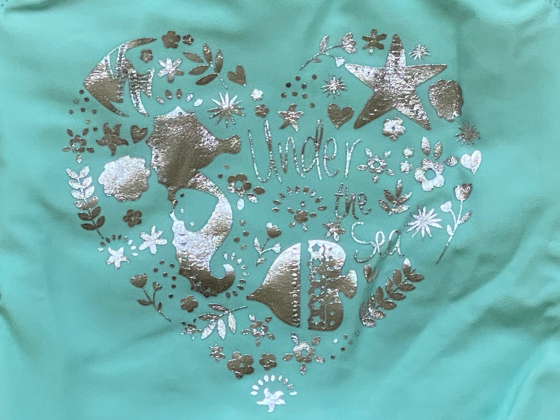 This girls swimming costume has a delightful 'Under the Sea' heart shaped foil print on the front, ideal for holidays, the beach, swimming lessons, fun and play!